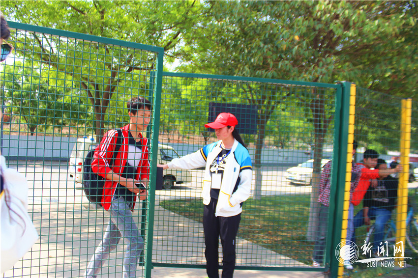 志愿者分為16組,共計100多人,戴著顯眼的小紅帽,他們主要協(xié)助裁判、參賽成員、賽場秩序搬運比賽用的器材、管制賽場流程、幫忙檢錄、恢復場地等,跑道上的志愿者還要為運動員們驅散跑道上的人員。在標準田徑場的南門默默站立著一位小姑娘,她的責任就是為同學開關門??此菩⌒〉呐e動,但在烈日炎炎下,能堅持下來的,也只有像她一樣的志愿者了吧。