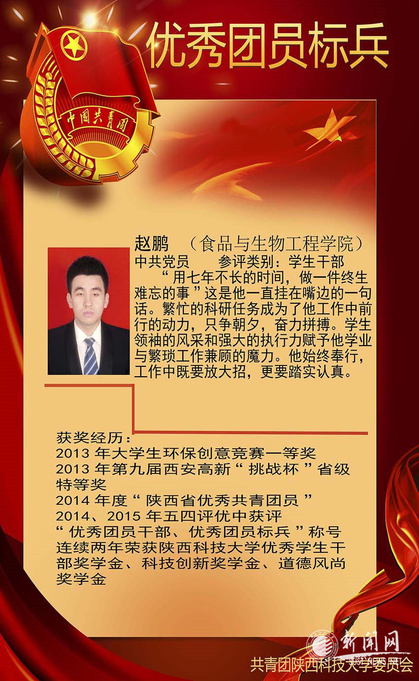 趙鵬,中共黨員,中藥學(xué)碩士在讀。本科就讀于陜西科技大學(xué)食品與生物工程學(xué)院藥物制劑專(zhuān)業(yè),曾任校學(xué)生會(huì)主席、省學(xué)聯(lián)社工部部長(zhǎng)、院學(xué)生會(huì)主席、紅螞蟻協(xié)會(huì)會(huì)長(zhǎng)、輔導(dǎo)員助理、新生班主任助理。現(xiàn)任食品學(xué)院團(tuán)委副書(shū)記(學(xué)生)、校團(tuán)委部長(zhǎng)助理、學(xué)生制藥專(zhuān)業(yè)(本科)黨支部書(shū)記,負(fù)責(zé)指導(dǎo)學(xué)院團(tuán)屬學(xué)生組織工作,以及協(xié)助負(fù)責(zé)學(xué)校志愿服務(wù)工作,是一名的優(yōu)秀共青團(tuán)干部。