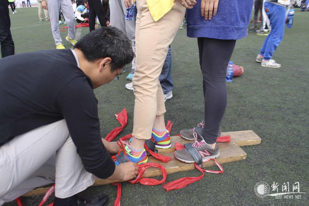 教工中年組女子和男子三人踏板競速分別與9:20和9:50進行。在開賽環(huán)節(jié),許多老師都來給要比賽的老師幫忙——用紅布系腳,粘膠帶,滿滿的關懷。在這里,競技精神得到了充分的體現(xiàn),在這里,三人成行,一起奔向終點。