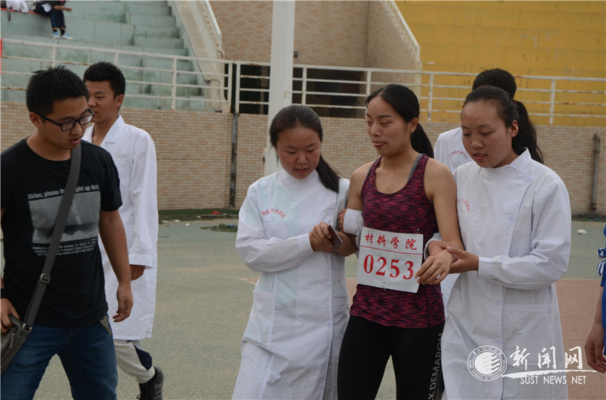 在大學生女子100米賽跑沖刺階段,一位運動員不慎摔倒,摔倒后,值班醫(yī)生迅速跑向受傷者身邊,細心詢問選手受傷情況,并把傷員送往校運動會醫(yī)療服務點進行緊急治療,經(jīng)診斷,該選手腳踝輕微扭傷,醫(yī)療人員先為傷員冷敷消腫,后進行熱敷按摩。