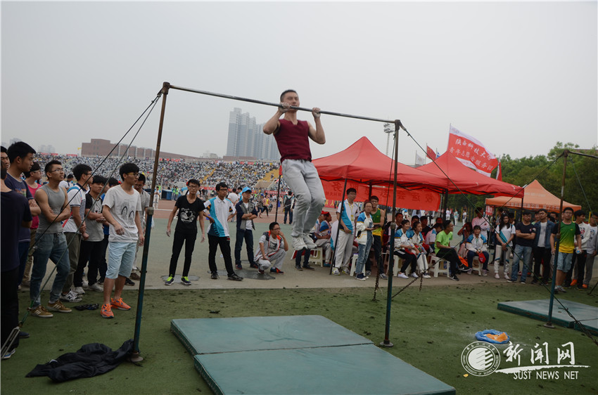 下午四點,本屆運動會的新增的一個大學生團體項目——引體向上比賽在標準田徑場西側(cè)處單杠進行。比賽時選手們在兩個單杠上同時進行,當一個學院的一個選手在參加比賽時,總是少不了其他同學的加油助威,“加油”“再來一個”一聲聲吶喊把同學們的心緊緊連在一起,選手們額頭汗水的冒出、流下,他們展現(xiàn)出了力量;咬著牙將身體抬起時,他們展現(xiàn)出了意志。經(jīng)過一番激烈的角逐,機電工程學院代表隊奪得冠軍,總成績?yōu)?80個,材料學院代表隊緊隨其后,總成績?yōu)?78個。