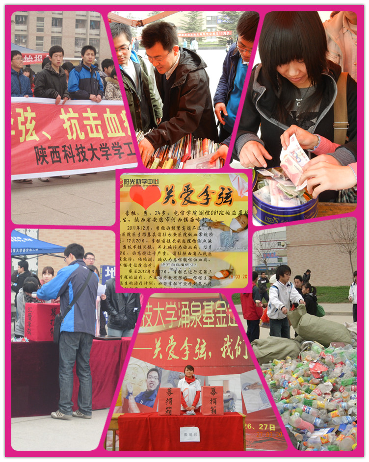 2012年2月25日,當?shù)弥钕彝瑢W身患白血病后,他立即組織了“匯愛李弦”的愛心活動。匯?;饡蜏y控08級學生一起到學生宿舍回收廢品,共收集到80000多個瓶子,籌到善款700多元。又連續(xù)三天組織了為李弦同學開展愛心接力行動——“匯愛李弦,抗擊血癌”的校園募捐活動。截止29日晚21點,募集善款總計67641.8元。2013年12月5日,他和匯?;饡耐瑢W們積極參與和西安14所高校共同開展的主題為清除古都“牛皮癬”的國際志愿者日鐘樓環(huán)?;顒??;顒油ㄟ^志愿者們清理街道小廣告,保護城市環(huán)境,呼吁號召市民參與環(huán)保事業(yè),共建美好家園。