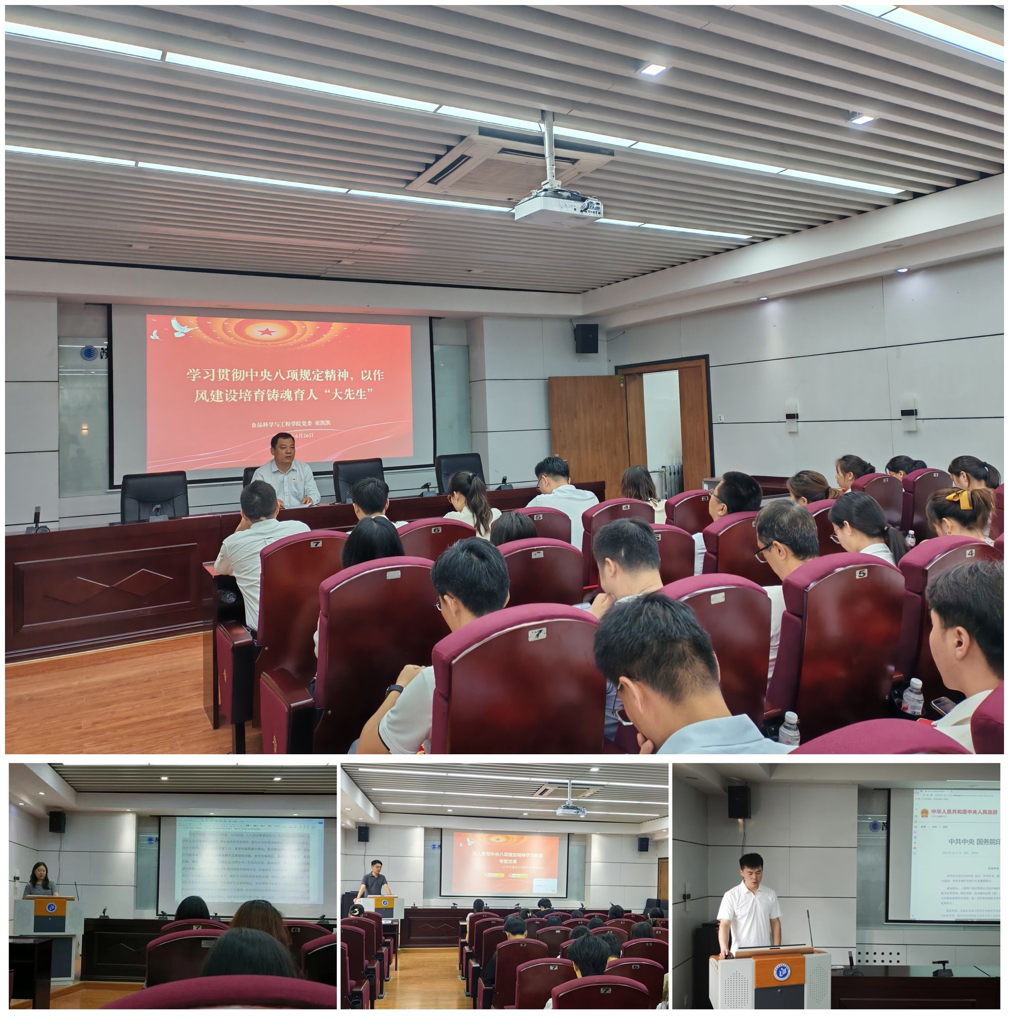 七一前夕,學院領導班子和各師生黨支部書記分別講授深入貫徹中央八項規(guī)定精神學習教育專題黨課。學院黨委書記張凱凱以《深入學習貫徹中央八項規(guī)定精神,以作風建設培育鑄魂育人“大先生”》為題進行授課,系統(tǒng)闡釋了教育領域踐行中央八項規(guī)定精神的重要意義。學院黨委委員、各師生黨支部書記圍繞深入貫徹中央八項規(guī)定精神學習教育心得體會,結(jié)合分管領域工作及支部特點講授專題黨課,持續(xù)推動中央八項規(guī)定精神在食品學院落地見效.