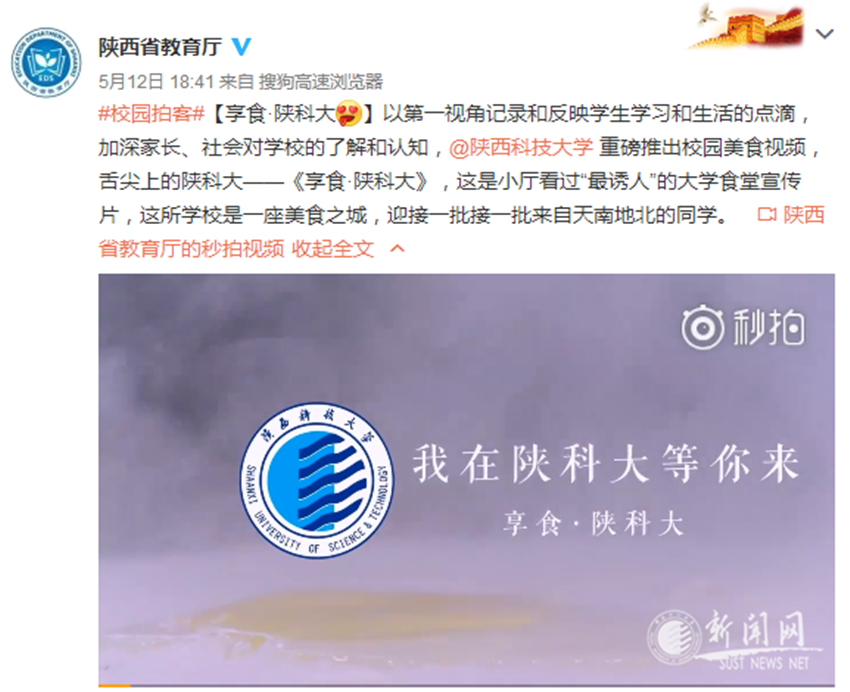 5月12日,陜西省教育廳官方微博報(bào)道我校本科招生系列微視頻“我在陜科大等你來”的第一部分之《享食·陜科大》。