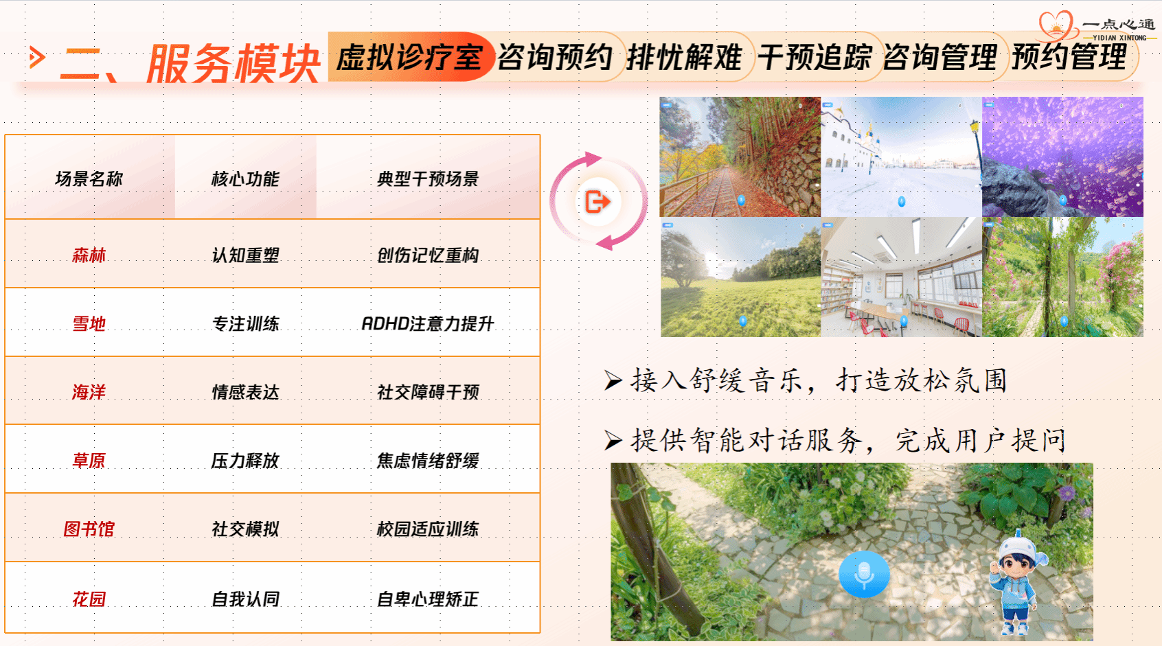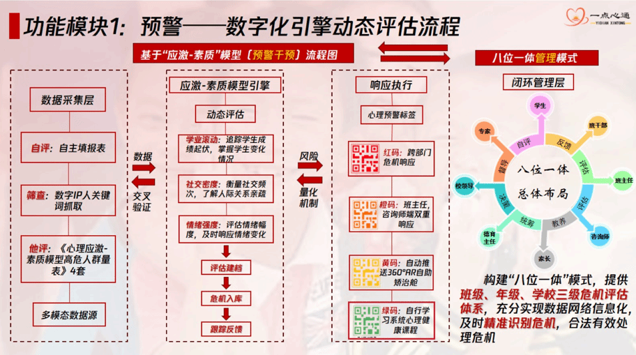 該平臺通過數(shù)智技術構建了“預警-服務-教育”三級聯(lián)動機制,八大角色前后銜接,協(xié)同構建心理健康教育模式閉環(huán)。在預警模塊,自主研發(fā)“心理危機篩查核心引擎”,首創(chuàng)心理“應激-素質”評估模型,結合多模態(tài)情緒數(shù)據(jù)監(jiān)測等技術,實現(xiàn)心理問題分層預警及動態(tài)實時賦碼,解決鄉(xiāng)村心理問題學生篩不準困境;在服務模塊,通過 AR現(xiàn)實增強技術創(chuàng)設6類3D心理干預場景,打造低成本“沉浸式移動心空間”,并搭建隱秘式“排憂解難”論壇,提供專業(yè)的心理問題疏導與咨詢服務,解決心理問題干預方式低數(shù)字困境;在教育模塊,利用人工智能技術打造 IP 心理學伴,集成自然語言處理(NLP)技術等自動觸發(fā)學伴的主動關懷機制,同時攜手心理專家研發(fā)特色網(wǎng)絡課程,通過開發(fā)項目式課程、案例式課程、游戲式課程,解決心理健康教育缺師資困境,實現(xiàn)心理問題從精準預警到科學干預、從教育培訓到心理素養(yǎng)提升的全流程服務?!耙稽c心通”數(shù)字化教育平臺以中小學生為核心服務群體,通過教師、家長、班主任、德育主任詢師及教育行政部門等八位一體布局,共同擴大“一點心通”平臺使用范圍,形成中小學心理健康服務體系。