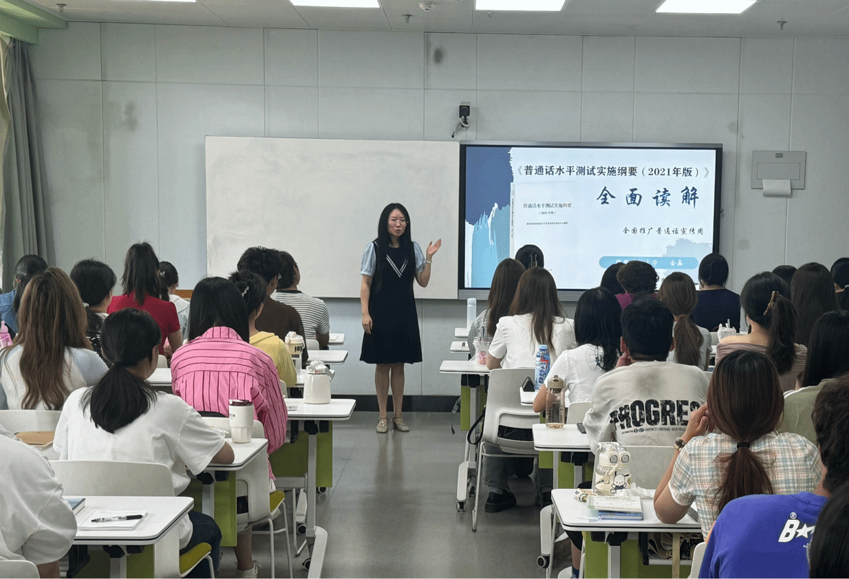 校內(nèi)活動百花齊放,涌現(xiàn)推普潮。舉辦《言說的現(xiàn)代化:普通話推廣與中國式現(xiàn)代化建設(shè)》《普通話水平測試實施綱要讀解》專題講座;為民族生定制《說好普通話,融入新校園》主題報告,助力民族學(xué)子快速適應(yīng)校園生活。中華經(jīng)典誦寫講基地舉辦了“推廣普通話,傳承抗戰(zhàn)精神”主題朗誦會,在宣傳推廣普通話和朗誦藝術(shù)的同時,進一步提升學(xué)生規(guī)范用語意識和社會責(zé)任感。校團委以“青春為中國式現(xiàn)代化挺膺擔(dān)當(dāng)”為主題,組織開展了“聲誦中國”經(jīng)典作品誦讀活動。普通話測試站緊扣推普周主題,組織師生以規(guī)范用語講述反法西斯斗爭故事,通過生動敘事傳承紅色基因,同步多渠道宣傳發(fā)動,吸引超千名師生報名普通話水平測試,實現(xiàn)“以測促學(xué)、以學(xué)促用”。
