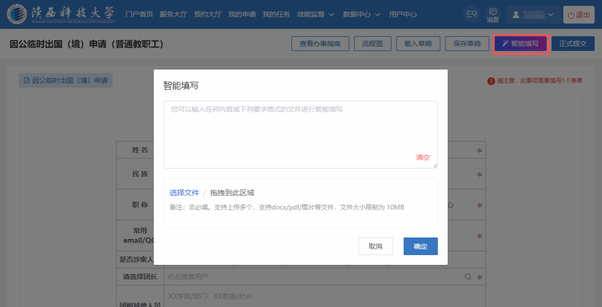 近期,我校網(wǎng)上辦事大廳系統(tǒng)進行了功能升級,開放了“智能填寫”功能,用AI賦能網(wǎng)辦相關(guān)事項填寫,為師生提供更為高效、便捷的智能辦事新體驗。