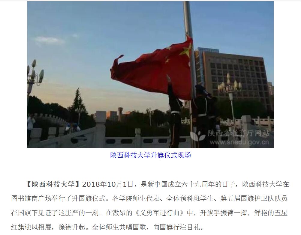 10月1號,陜西省教育廳門戶網(wǎng)站在頭版“熱點聚焦”的《我愛您,祖國!陜西師生歡慶中華人民共和國成立69周年》報道中,報道了陜西科技大學(xué)舉行升國旗儀式慶祝祖國母親69歲生日。