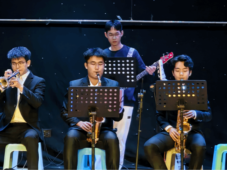 演出現(xiàn)場(chǎng),古箏的悠揚(yáng)、竹笛的清脆與電聲樂器的激昂交織碰撞。民樂協(xié)奏曲《寄明月》以悠揚(yáng)旋律,引發(fā)在場(chǎng)觀眾共鳴;管樂協(xié)奏曲《鋼鐵洪流進(jìn)行曲》氣勢(shì)恢宏,喚起同學(xué)們內(nèi)心力量。2024年被“中國(guó)青年報(bào)”轉(zhuǎn)載的曲目《云宮迅音》再次演繹,傳統(tǒng)民樂與現(xiàn)代電聲器樂的融合,讓現(xiàn)場(chǎng)觀眾沉浸式感受民族音樂與現(xiàn)代音樂碰撞的獨(dú)特魅力;演出尾聲,全體同學(xué)共同演奏《送別》,熟悉的旋律引發(fā)全場(chǎng)大合唱,將活動(dòng)推向高潮。
