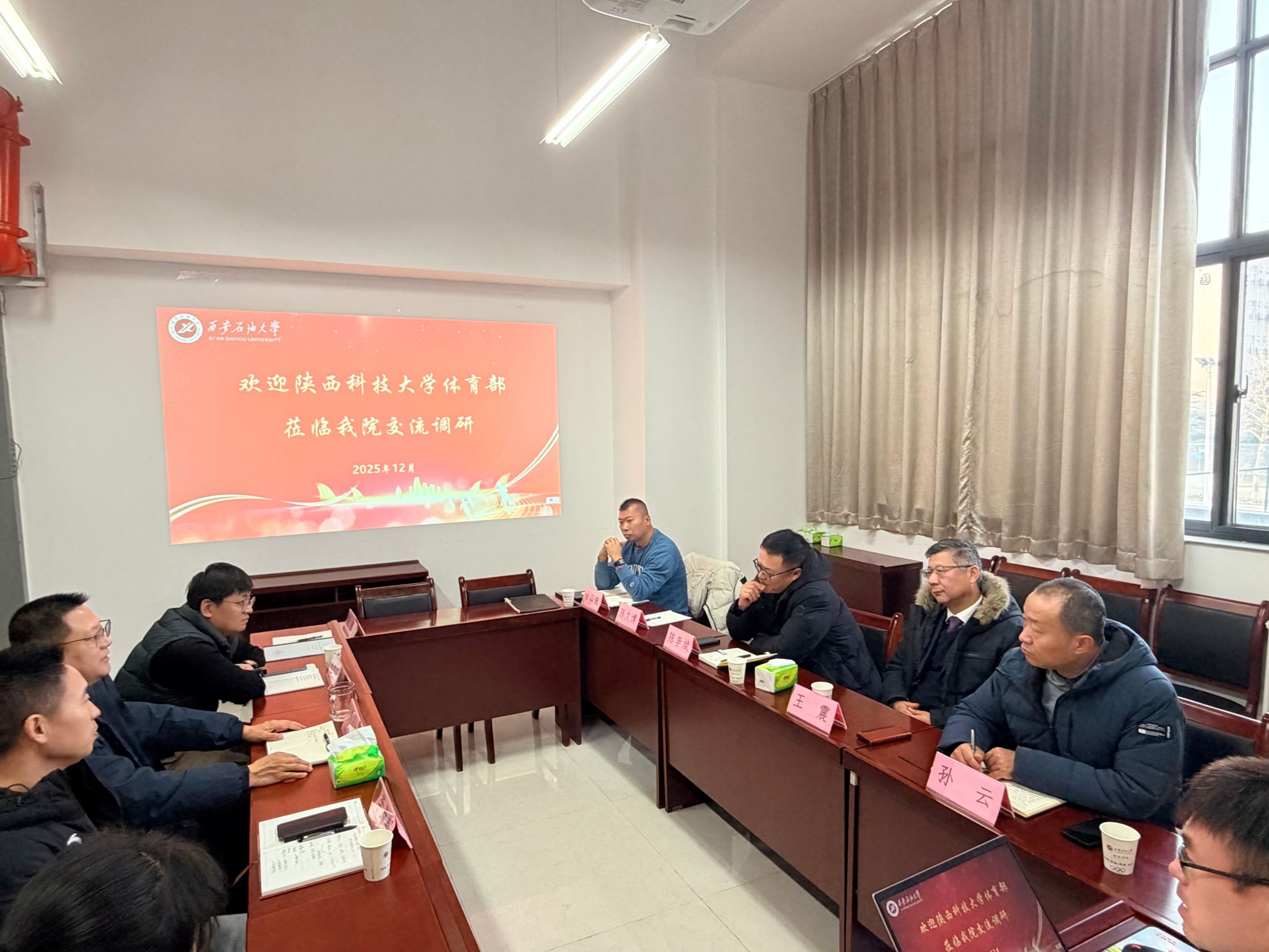 為深化體育教學(xué)改革,優(yōu)化場地設(shè)施建設(shè),提升體育工作質(zhì)量,12月18日,陜西科技大學(xué)體育部黨支部書記陳李斌、主任王震帶隊一行赴西安石油大學(xué)開展調(diào)研交流活動。