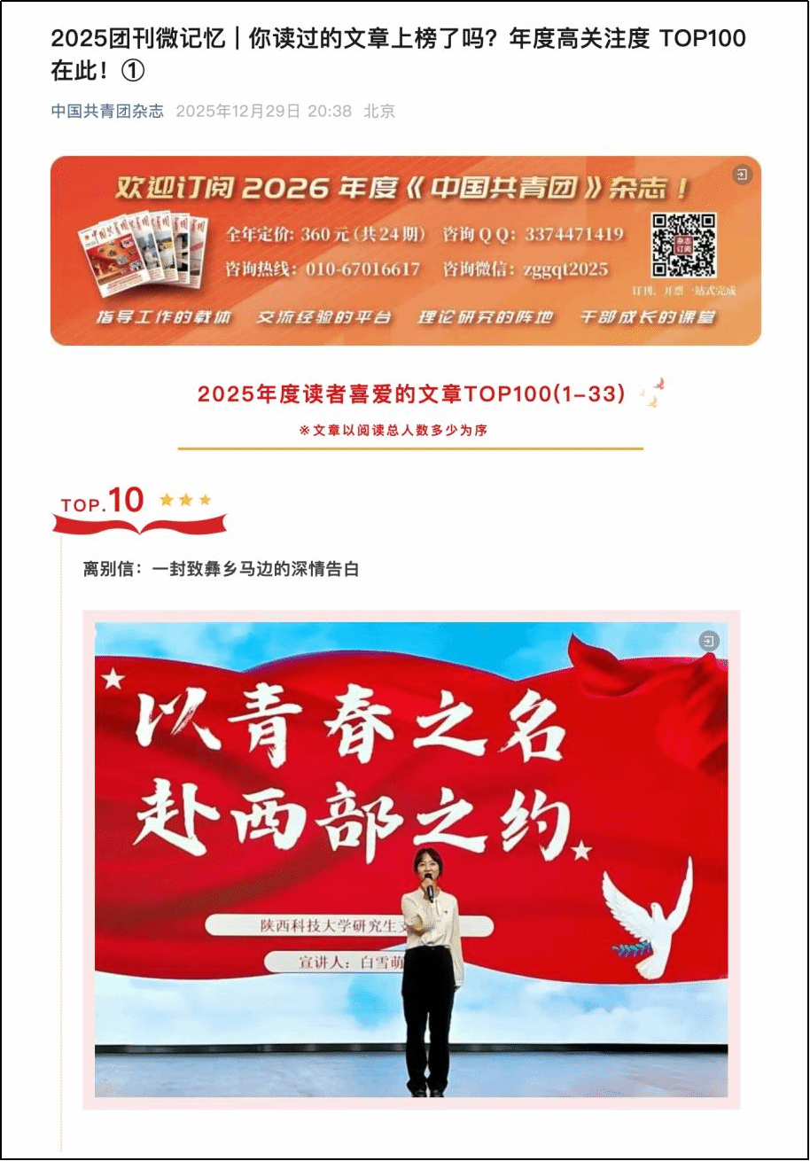 陜西科技大學(xué)第26屆研支團(tuán)文章登榜《中國(guó)共青團(tuán)雜志》2025年度讀者喜愛的文章TOP10