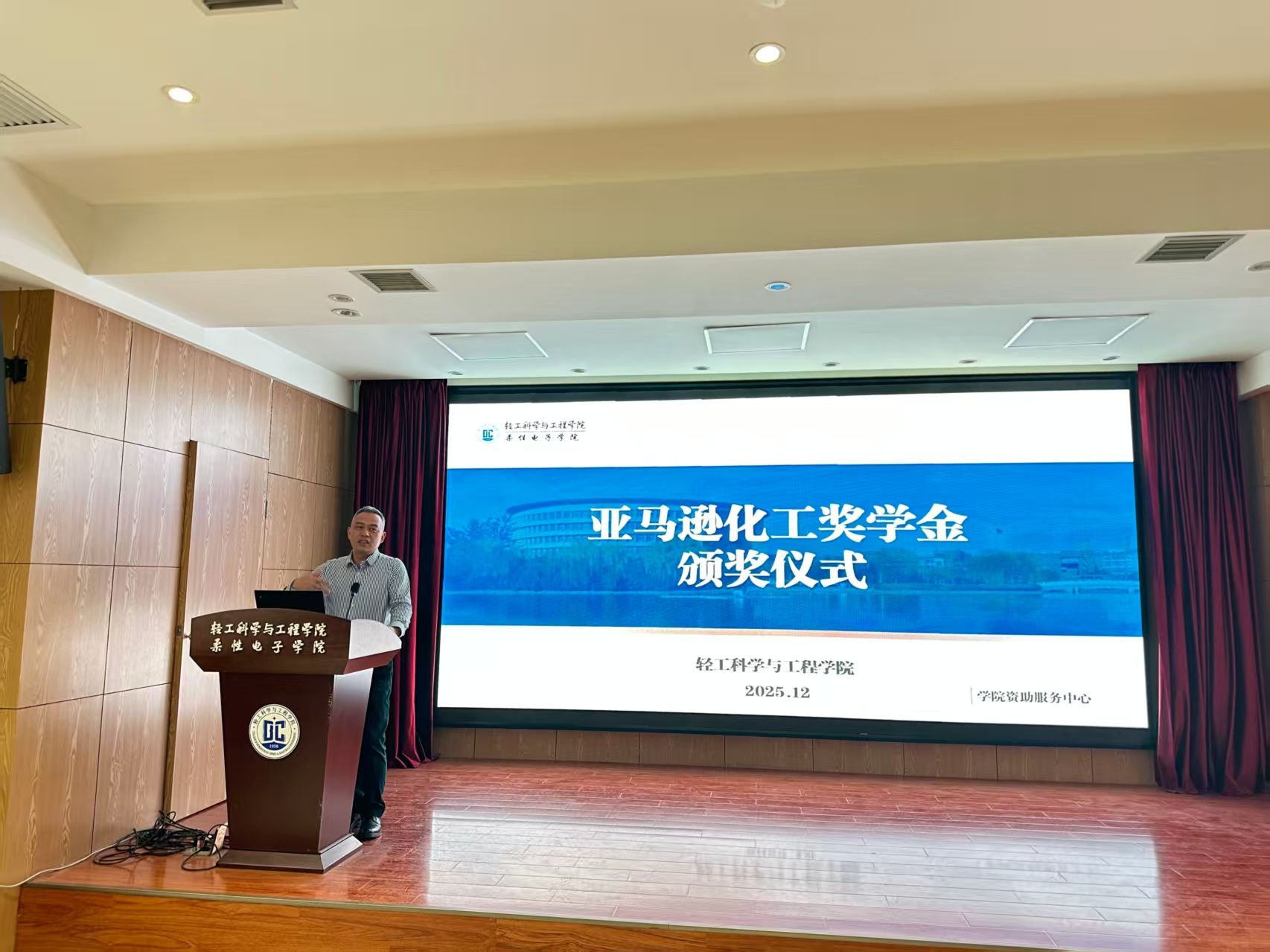 12月29日,2025年度“亞馬遜化工獎(jiǎng)學(xué)金”頒獎(jiǎng)儀式在輕工學(xué)院一樓學(xué)術(shù)報(bào)告廳隆重舉行。亞馬遜化工集團(tuán)中國(guó)區(qū)銷(xiāo)售總監(jiān)劉剛、研發(fā)技術(shù)經(jīng)理周忠毅,輕工學(xué)院院長(zhǎng)呂斌、黨委副書(shū)記張乾隆、副院長(zhǎng)劉國(guó)棟、造紙工程系主任羅清及輕化工程專(zhuān)業(yè)學(xué)生代表出席本次儀式。