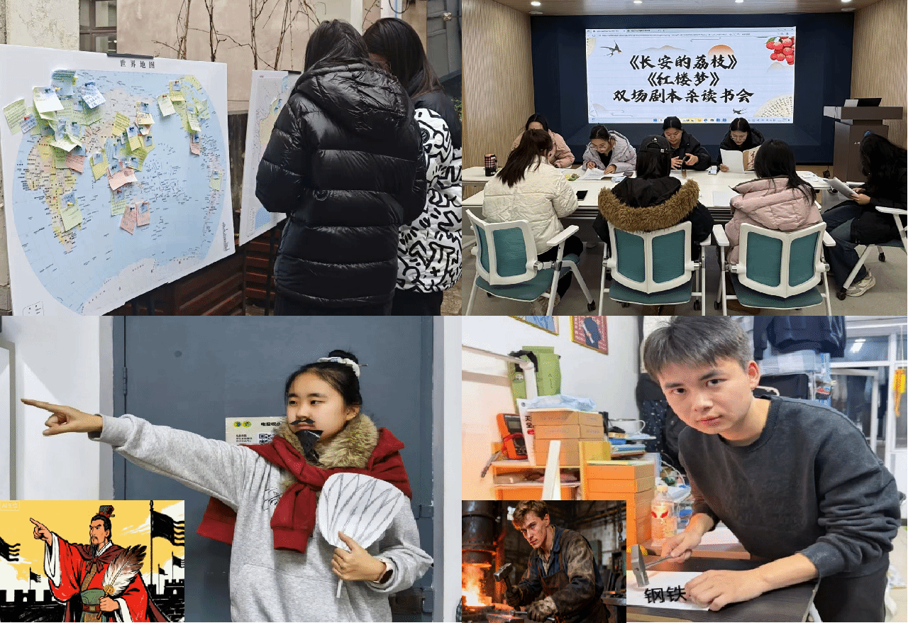 “一書一世界”閱讀地理坐標活動,引導學子將喜愛書籍名稱與閱讀感悟貼于世界地圖對應(yīng)位置,從《百年孤獨》的南美風情到《追風箏的人》的異域人生,在實踐中打破傳統(tǒng)閱讀單向壁壘,深化理解并拓寬多元文化視野。借用文學劇本殺讀書會新形式,精選《長安的荔枝》《紅樓夢》兩個經(jīng)典著作,設(shè)雙場同步體驗,讓參與者化身書中角色,在沉浸式劇情推演中探尋原著內(nèi)核,體悟責任擔當,感受書中精神韻味?!皶7滦恪币浴耙幻隿osplay名著”為口號,鼓勵學子用“原著原圖+創(chuàng)意模仿圖”還原經(jīng)典名場面,作品兼具復刻精度與青春創(chuàng)意,線上傳播后引發(fā)師生熱議分享。