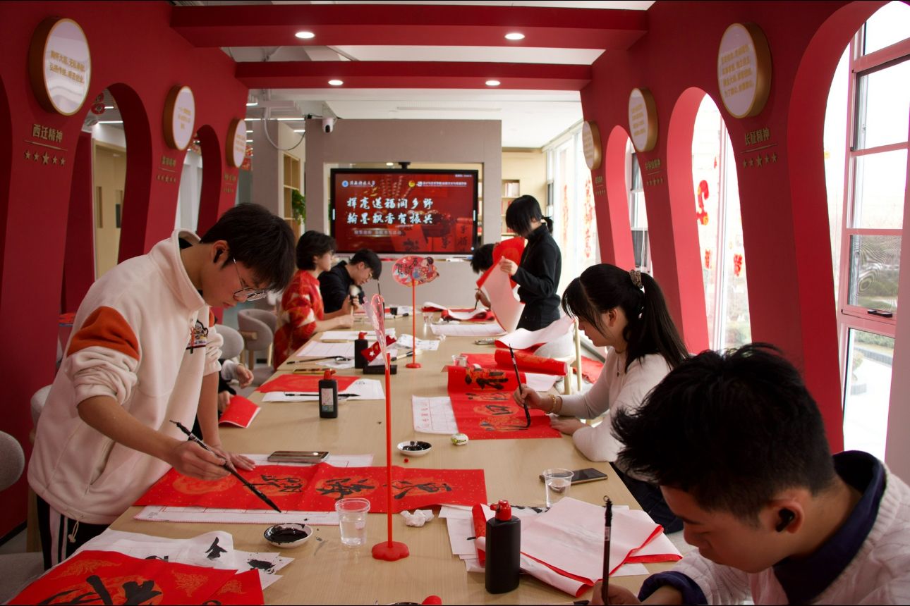 三家單位精心組織教職工書畫家協(xié)會(huì)、大學(xué)生書法協(xié)會(huì)、咸陽市墨道書法協(xié)會(huì)共30余名師生,現(xiàn)場(chǎng)凝神揮毫,筆走龍蛇。一幅幅承載美好愿景的春聯(lián)、一個(gè)個(gè)蒼勁有力的“福”字躍然紙上,既飽含對(duì)新年的真誠祝福,更浸潤(rùn)著中華優(yōu)秀傳統(tǒng)文化的深厚底蘊(yùn)。活動(dòng)累計(jì)書寫春聯(lián)和福字400余幅。此次活動(dòng)緊密結(jié)合學(xué)校特色優(yōu)勢(shì),精準(zhǔn)契合服務(wù)地方發(fā)展和引領(lǐng)學(xué)生成長(zhǎng)成才,不僅是踐行推進(jìn)城鄉(xiāng)文化融合發(fā)展的生動(dòng)實(shí)踐,更是一堂以文化人、以文惠民、以文興業(yè)的鮮活課堂。