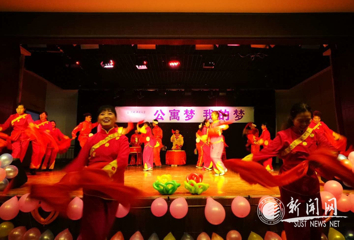 晚會(huì)以“公寓夢(mèng)·我的夢(mèng)”為主題,在管理員和自管會(huì)同學(xué)共同精心編排的腰鼓表演中拉開(kāi)序幕?!吨袊?guó)夢(mèng)》、《飛揚(yáng)的鼓聲》、《開(kāi)開(kāi)心心每一天》、《天上的西藏》等舞蹈,展示了公寓員工們昂揚(yáng)向上的精神面貌,三句半《贊科大發(fā)展》獲得在場(chǎng)觀(guān)眾掌聲陣陣,詩(shī)朗誦《珍惜工作,服務(wù)同學(xué)》更是將晚會(huì)掀起高潮,公寓阿姨們用樸素的言語(yǔ)道出了她們與學(xué)生之間化不開(kāi)的親情與友情。