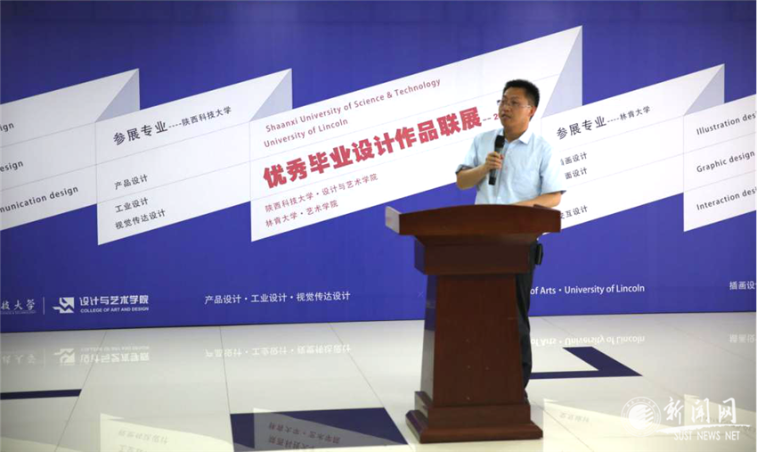 Dave Bramston首先感謝設(shè)藝學(xué)院提供本次藝術(shù)交流的機(jī)會。他表示,這是他第一次到訪陜西科技大學(xué),對我校學(xué)生的作品非常感興趣,希望能達(dá)到深度交流。本次中英大學(xué)生藝術(shù)作品展開啟了雙方藝術(shù)交流的新篇章。林肯大學(xué)學(xué)生的作品體現(xiàn)了英國本土的文化特色,希望雙方學(xué)生通過本次交流,迸發(fā)出新的藝術(shù)火花。