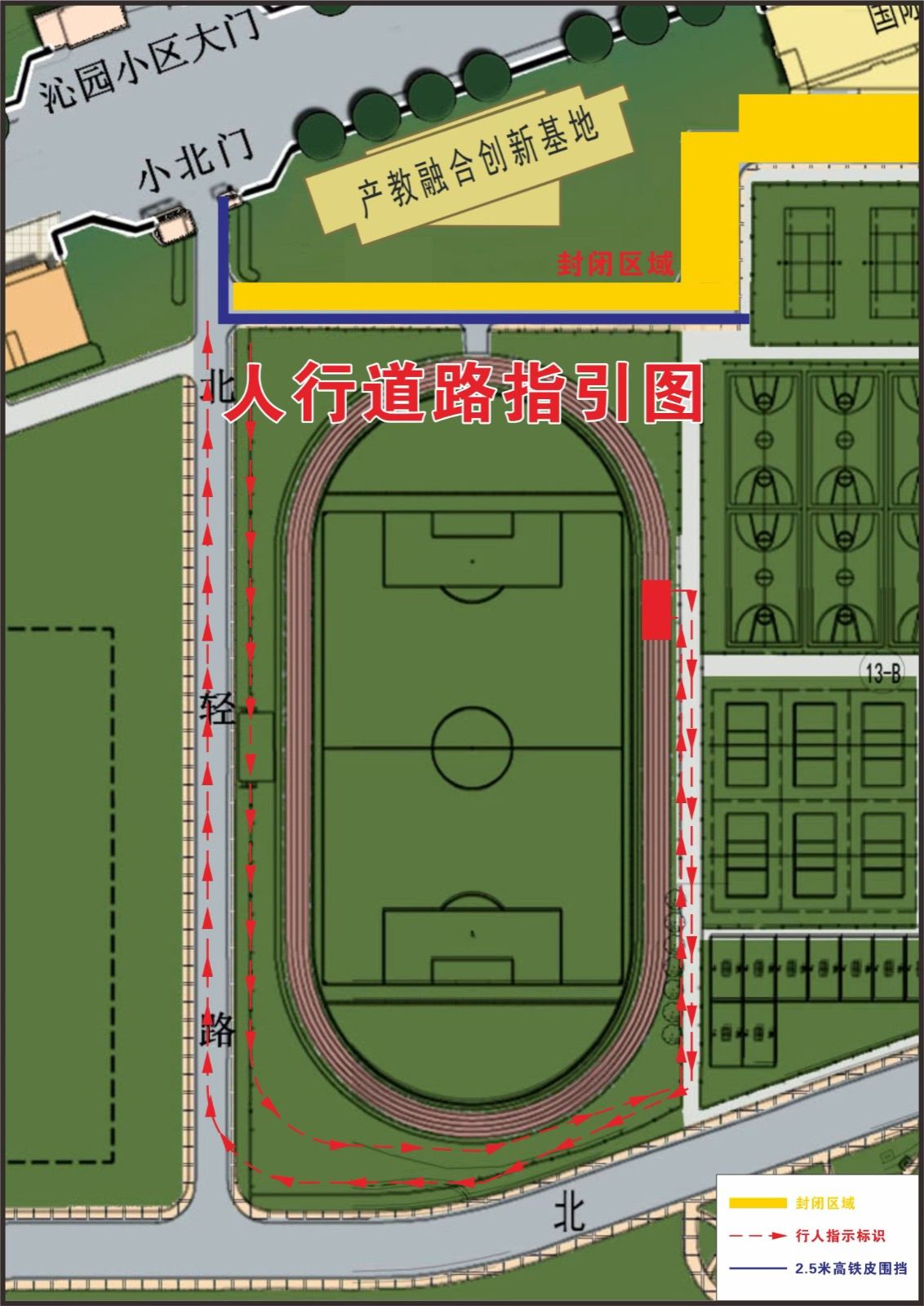 封閉期間,進(jìn)出田徑場(chǎng)需臨時(shí)繞行至球場(chǎng)東入口,從封閉口西端前往餐廳需經(jīng)北輕路、北環(huán)路臨時(shí)繞行第二田徑場(chǎng)東側(cè)道路。