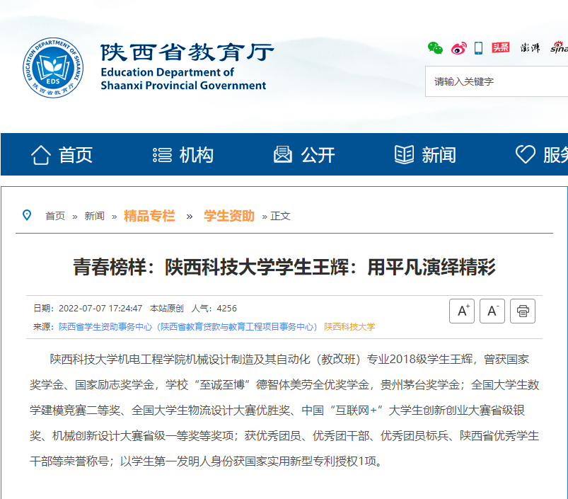 陜西省教育廳網(wǎng)站:青春榜樣:陜西科技大學(xué)學(xué)生王輝:用平凡演繹精彩