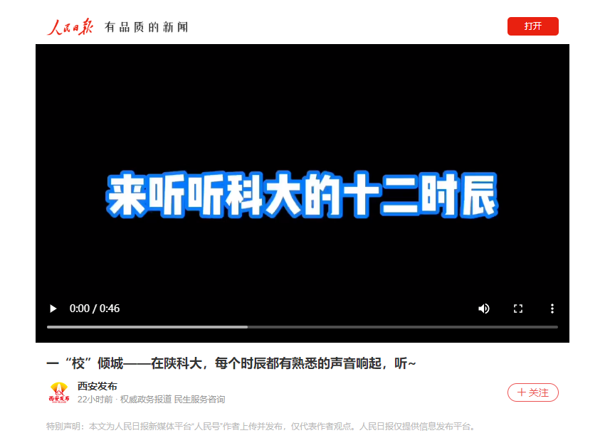 近日,“西安發(fā)布”通過人民號、新浪微博、百家號、今日頭條等媒體平臺推送了短視頻《來聽聽科大的十二時辰》。