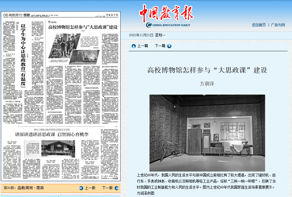 《中國教育報》11月21日“高教周刊·思政”刊發(fā)我校中國輕工業(yè)博物館館長方潤澤署名文章《高校博物館怎樣參與“大思政課”建設(shè)》。