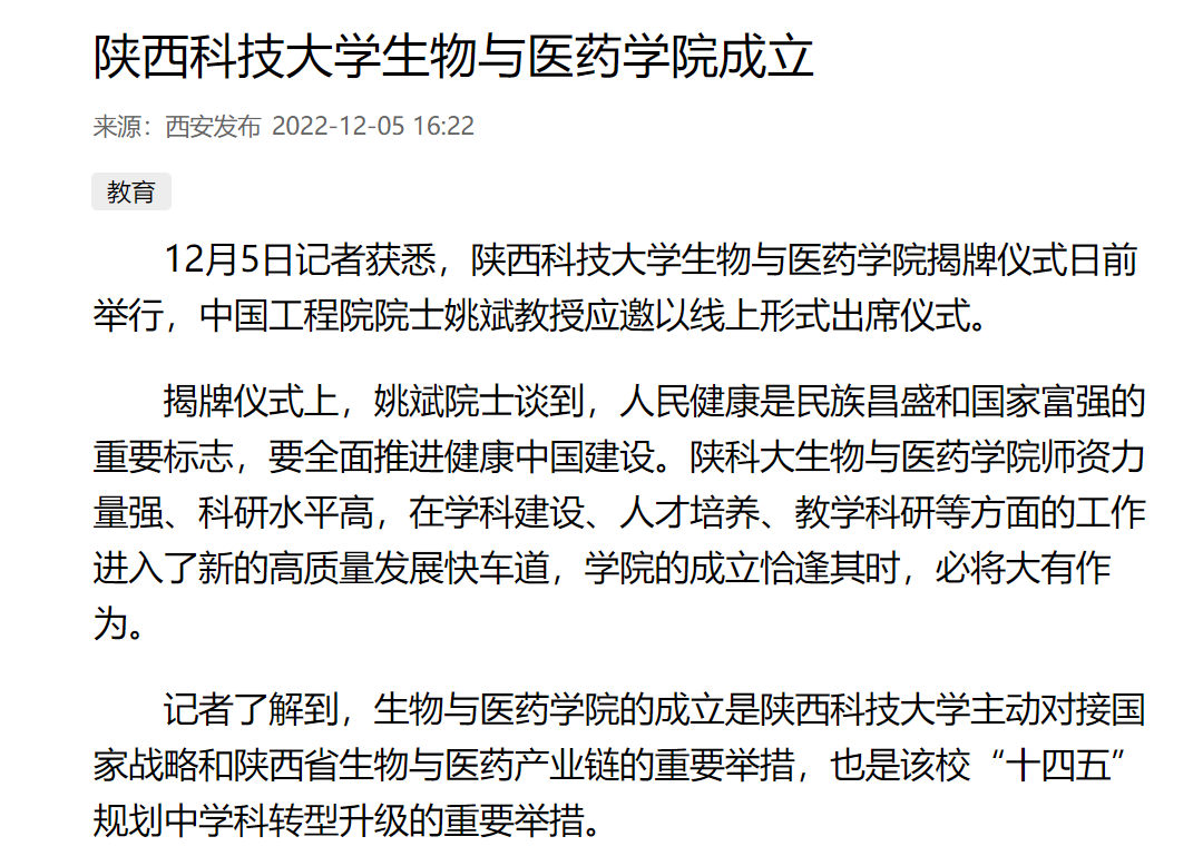 西安發(fā)布:陜西科技大學生物與醫(yī)藥學院成立