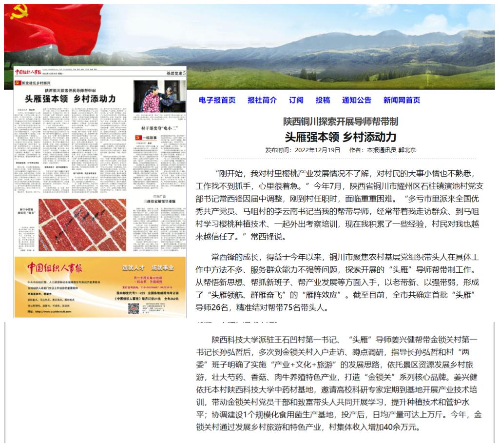 近日,《中國組織人事報(bào)》報(bào)道我校派駐王石凹村第一書記、“頭雁”導(dǎo)師姜興健幫帶產(chǎn)業(yè)發(fā)展事跡。