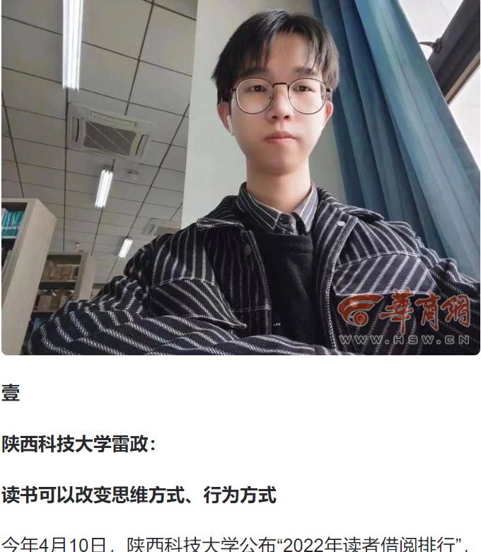 近日,華商頭條、二三里資訊報道2022年位列我校圖書借閱榜首的雷政同學的閱讀故事。