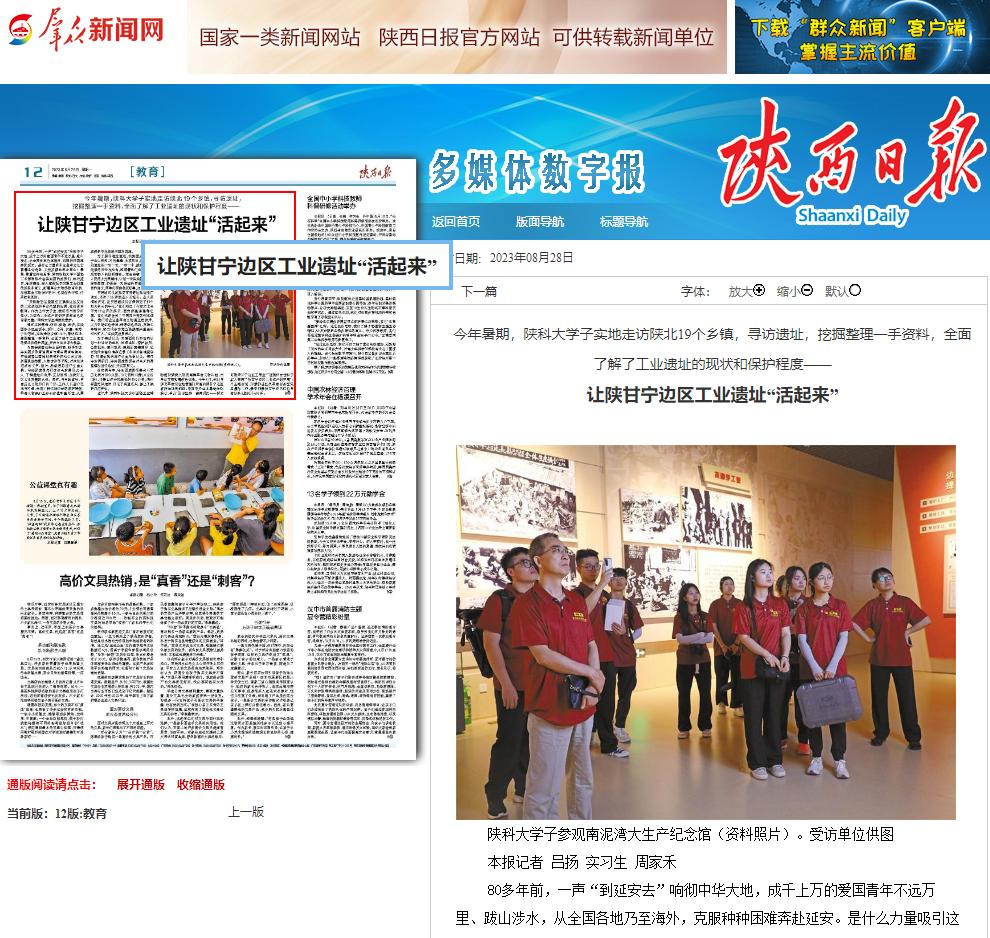 近日,《陜西日?qǐng)?bào)》報(bào)道我校學(xué)子讓陜甘寧邊區(qū)工業(yè)遺址“活起來(lái)”。
