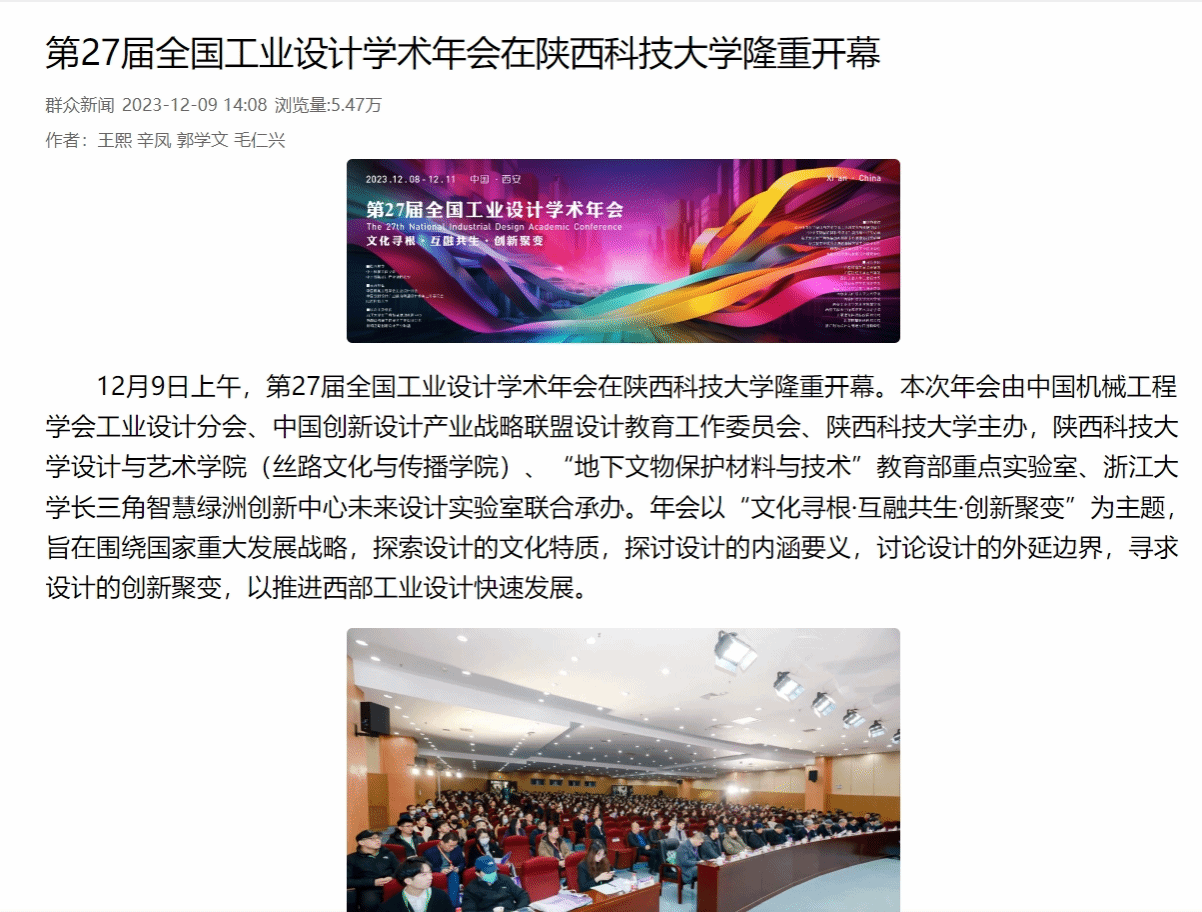 近日,群眾新聞、鳳凰網(wǎng)報(bào)道第27屆全國(guó)工業(yè)設(shè)計(jì)學(xué)術(shù)年會(huì)在陜西科技大學(xué)成功舉辦。