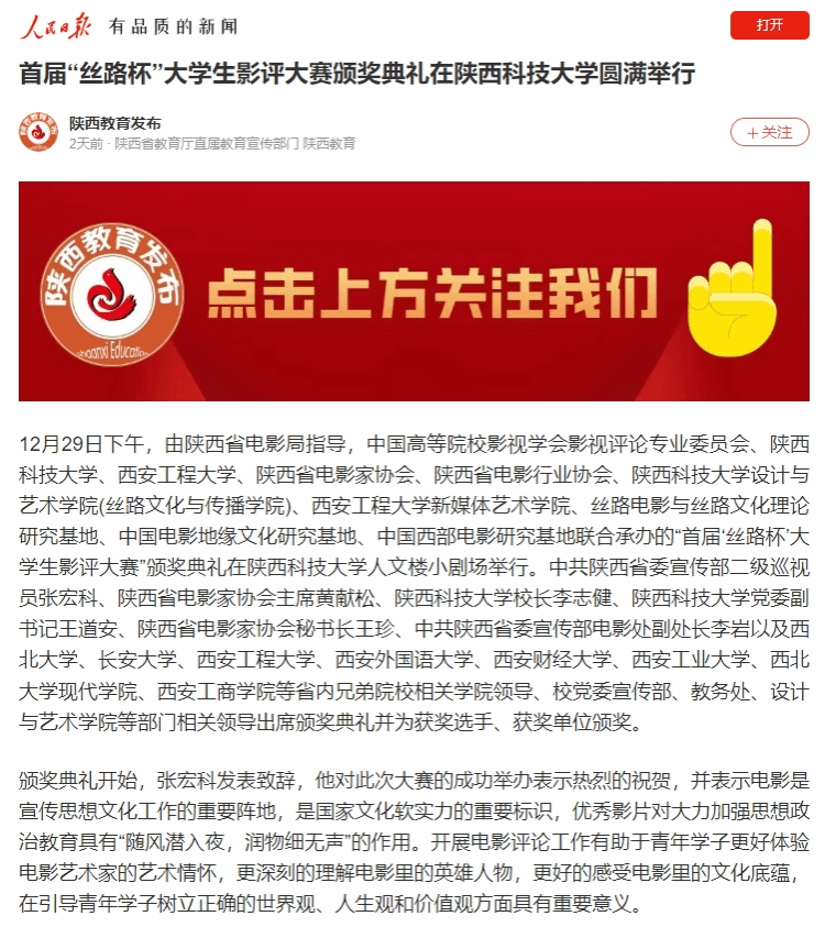 近日,《人民日報》APP、陜西衛(wèi)視、群眾新聞網(wǎng)、今日頭條、搜狐新聞APP、中國網(wǎng)、文旅中國APP等媒體報道首屆“絲路杯”大學(xué)生影評大賽頒獎典禮在我校舉行。