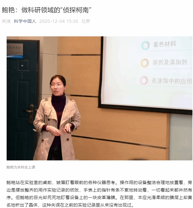 近日,《科學(xué)中國人》官方微信公眾號報道我校鮑艷教授做科研領(lǐng)域的“偵探柯南”。