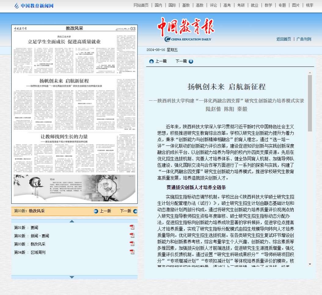 《中國(guó)教育報(bào)》:揚(yáng)帆創(chuàng)未來(lái) 啟航新征程——陜西科技大學(xué)構(gòu)建“一體化兩融合四支撐”研究生創(chuàng)新能力培養(yǎng)模式實(shí)錄