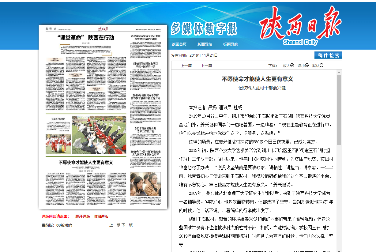 11月21日,《陜西日?qǐng)?bào)》以不辱使命才能使人生更有意義--記陜科大駐村干部姜興健為題,報(bào)道了我校駐村干部姜興健駐村扶貧事跡,鏈接如下:陜西日?qǐng)?bào):不辱使命才能使人生更有意義——記陜科大駐村干部姜興健