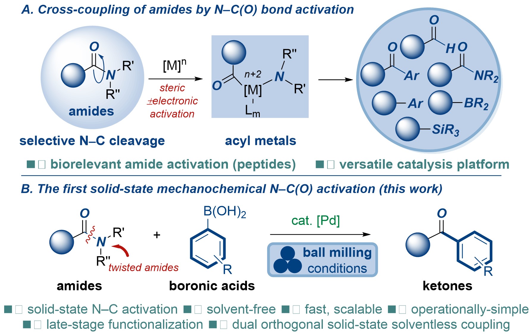 “Mechanochemical Solvent-Free Suzuki–Miyaura Cross-Coupling of Amides via Highly Chemoselective N–C Cleavage首次將機(jī)械化學(xué)方法應(yīng)用于碳氮鍵選擇性斷裂的Suzuki-Miyaura交叉偶聯(lián)反應(yīng)。反應(yīng)過程不需要任何有機(jī)溶劑與額外加熱,后處理簡單,反應(yīng)高效,并可用于醫(yī)藥中間體的合成、復(fù)雜藥物的后期修飾與機(jī)械化學(xué)條件下的串聯(lián)偶聯(lián)反應(yīng)。本研究不僅豐富了酰胺鍵的活化反應(yīng)研究,而且為有機(jī)合成化學(xué)中惰性化學(xué)鍵的活化反應(yīng)提供了新思路。