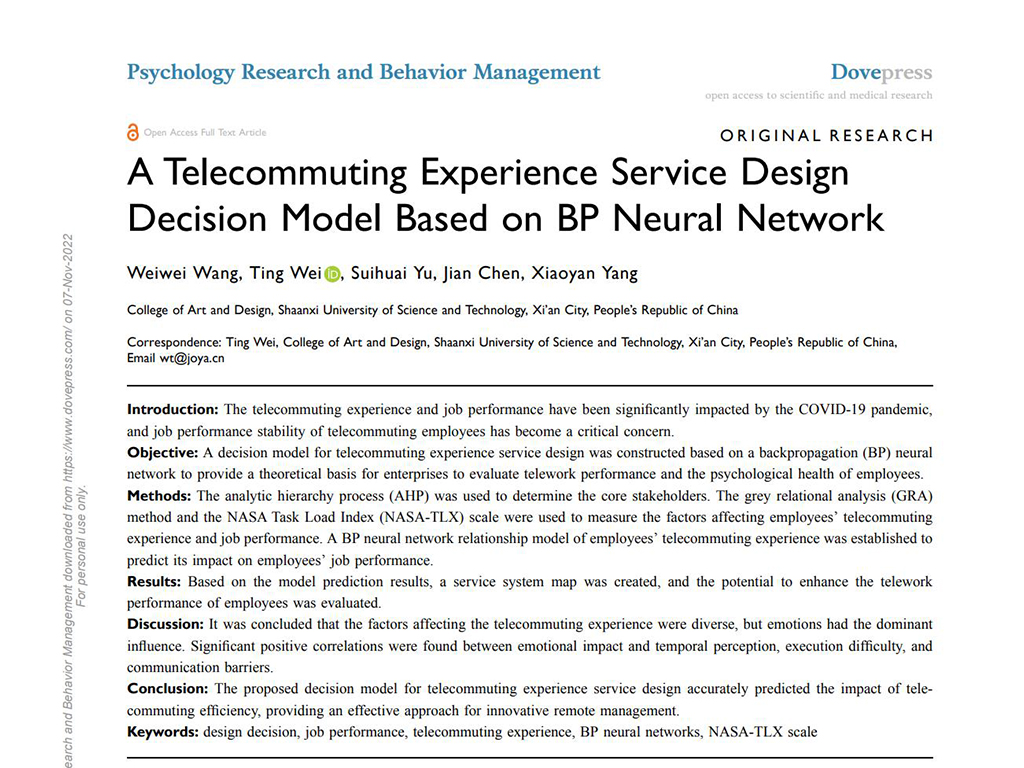 [1] Weiwei Wang, Ting Wei, Suihuai Yu, Xiaoyan Yang. A Telecommuting Experience Service Design Decision Model Based on BP Neural Network. Psychology Research and Behavior Management. 2022(15): 3147—3166.(影響因子3.974)