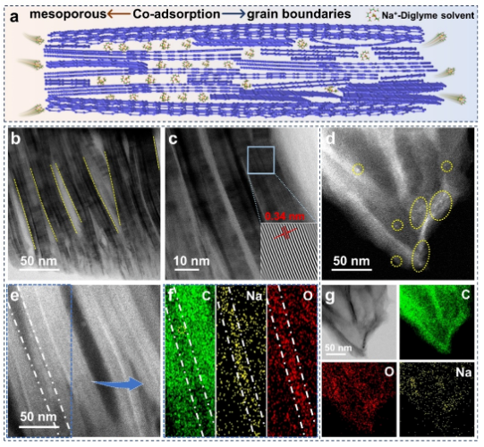 許并社團(tuán)隊(duì)郝曉東副教授與材料學(xué)院劉曉旭教授在儲鈉領(lǐng)域取得重大突破。即,①合成了一種含有序晶界與介孔的微晶石墨電極材料;②發(fā)現(xiàn)可在其納米尺度的有序晶界及介孔中實(shí)現(xiàn)“共吸附”儲鈉;③利用球差校正透射電子顯微學(xué)(Cs-STEM)和X射線能譜儀(EDS)技術(shù)在原子尺度下深入揭示了石墨電極的“共吸附”儲鈉行為與機(jī)制;④在結(jié)晶碳材料儲鈉有著廣泛的應(yīng)用前景。
