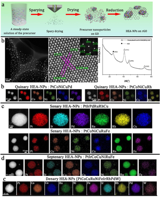 許并社團(tuán)隊(duì)郝曉東副教授與西北有色金屬研究院趙盤巢副研究員在高熵合金納米材料領(lǐng)域取得重大突破。即,①開發(fā)了一種簡單、高效和大規(guī)模制備高熵合金納米材料的技術(shù)—噴霧干燥結(jié)合熱分解還原方法;②實(shí)現(xiàn)了在溫和條件下合成石墨烯載2-10元鉑基高熵合金納米粒子;③利用球差校正透射電子顯微學(xué)(Cs-STEM)與X射線能譜儀(EDS)技術(shù)在原子尺度下深入研究了鉑元素自催化作用及促進(jìn)高熵合金納米粒子形成機(jī)理;⑤在高熵合金納米材料設(shè)計(jì)與合成領(lǐng)域具有廣泛的應(yīng)用前景。