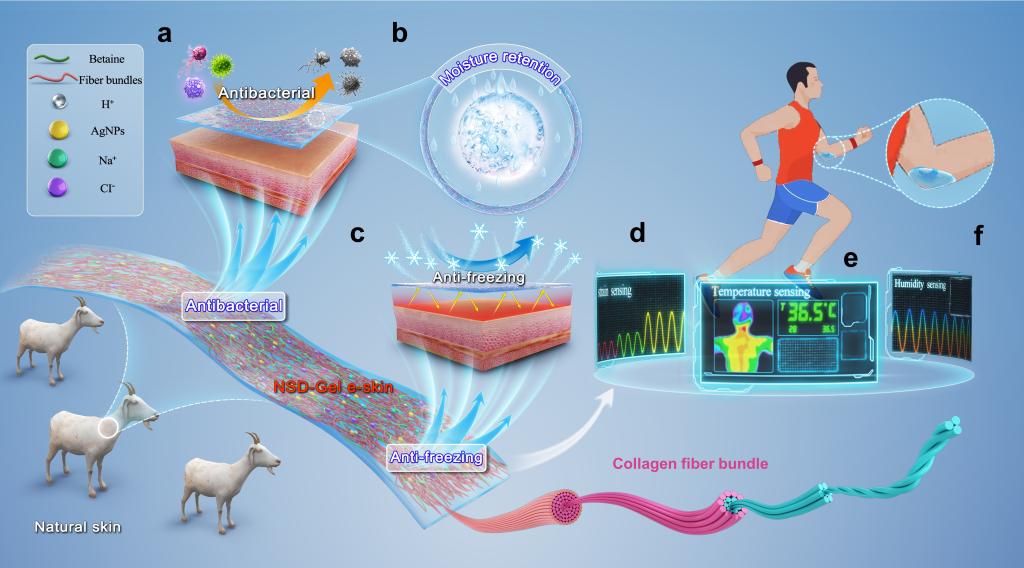 電子皮膚(e-skins)在機械性能上與人體皮膚類似,被認為是用于無創(chuàng)人機交互和可穿戴設(shè)備的理想電子裝置。為了完全模仿人類皮膚,電子皮膚應(yīng)該擁有可靠的機械性能;同時能夠抵抗外部環(huán)境變化,如熱、冷、干燥和細菌;并且能夠感知多種外部刺激,如溫度、濕度和應(yīng)變。研究采用簡單的一鍋法,以天然皮膚為基材,并引入甜菜堿、銀納米粒子(AgNPs)、氯化鈉(NaCl)和甘油/水二元溶劑形成的混合液,以納米化方式設(shè)計了一種全新的多功能天然皮膚基有機水凝膠電子皮膚(NSD-Gel e-skin)。NSD-Gel e-skin顯示出良好的透明度以及優(yōu)異的拉伸強度(7.33 MPa)、抗穿刺性、保濕性、回濕性和抗菌性。此外,NSD-Gel e-skin具有優(yōu)異的耐寒/耐熱性和刺激反應(yīng)特性,可以有效地感知環(huán)境溫度或濕度的變化,以及監(jiān)測人體生理/運動信號。體外和體內(nèi)實驗表明,NSD-Gel e-skin具有理想的生物相容性,即使在惡劣的環(huán)境中(-196℃至100℃)也能起到組織保護作用。NSD-Gel e-skin在可穿戴電子設(shè)備、人機界面和人工智能等領(lǐng)域具有巨大的應(yīng)用潛力,為開發(fā)具有按需特性的高性能電子皮膚提供了一個重要平臺。