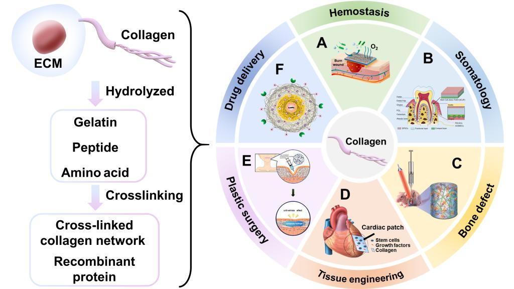圖3 膠原基生物材料(CBBs)的醫(yī)學應(yīng)用。膠原可以根據(jù)不同的水解條件水解成明膠、肽和氨基酸,然后交聯(lián)成膠原網(wǎng)絡(luò)和重組蛋白。CBBs被廣泛地應(yīng)用于以下方面:(A)止血;(B)口腔醫(yī)學;(C)骨缺損修復(fù);(D)組織工程;(E)整形外科和(F)藥物輸送