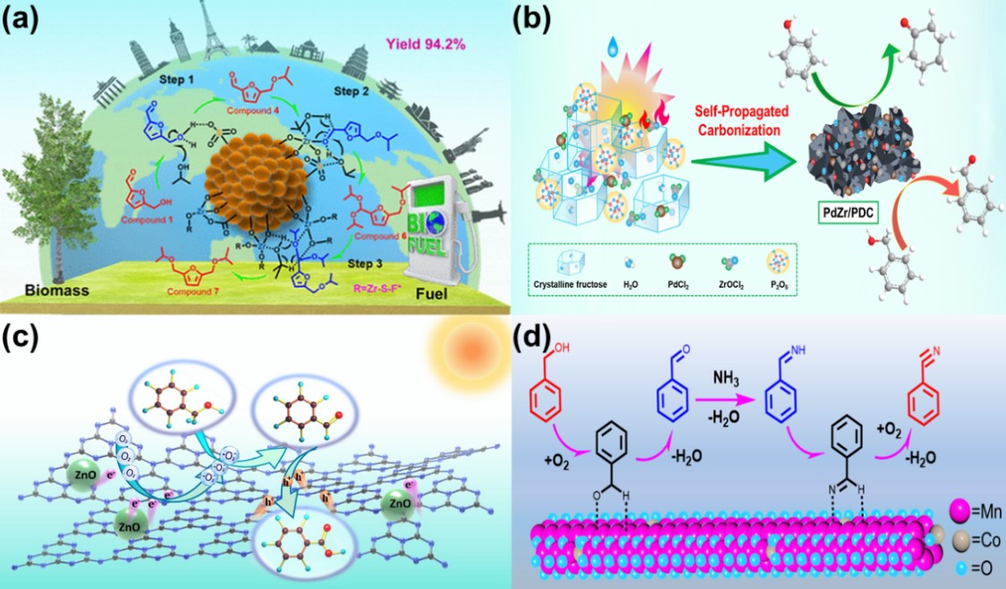 圖1 生物質(zhì)催化轉(zhuǎn)化方面:a)HMF一鍋還原醚化;b)SPC制備磷摻雜碳材料;c)Z型異質(zhì)結(jié)ZnO/C3N4光催化劑用于苯甲醇的高效選擇性光催化氧化;d)CoOx/MnO2直接催化氧化腈化制腈化物
