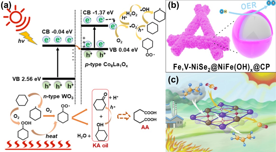 圖2 光、光熱催化方面:a)Z型異質(zhì)結(jié)CoLaOx/WO3光熱催化環(huán)己烷制KA油;b)Fe,V-NiSe2@NiFe(OH)x作為OER反應(yīng)的高效電催化劑;c)光熱協(xié)同催化CO2氧化丙烷脫氫制丙烯和CO