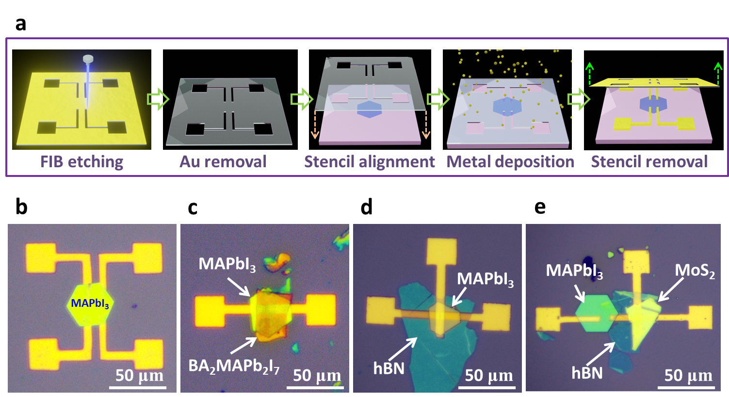 有機(jī)-無機(jī)雜化鈣鈦礦因其卓越的光學(xué)特性而備受關(guān)注,可用于開發(fā)新型光電器件。然而,用于制備雜化鈣鈦礦器件的光刻技術(shù)仍面臨巨大的挑戰(zhàn)。這主要是因為雜化鈣鈦礦材料在丙酮、水等光刻溶劑中極易受到損壞,因此傳統(tǒng)光刻技術(shù)無法與雜化鈣鈦礦材料兼容。韓斌副教授帶領(lǐng)研究生劉博、王光輝、邱琪等人經(jīng)過三年的努力,攻克了雜化鈣鈦礦納米器件制造的難題,開發(fā)了一種與雜化鈣鈦礦完美兼容的新型聚焦離子束(FIB)輔助透明納米掩膜光刻技術(shù)。該技術(shù)能夠?qū)崿F(xiàn)100納米的超高光刻分辨率,并且可以實現(xiàn)精準(zhǔn)的掩模板對準(zhǔn)。此外,該掩膜版可以重復(fù)使用十多次,極大地降低了器件制造成本。該技術(shù)的開發(fā)將有助于雜化鈣鈦礦新型器件的開發(fā)以及器件的微型化和集成化。