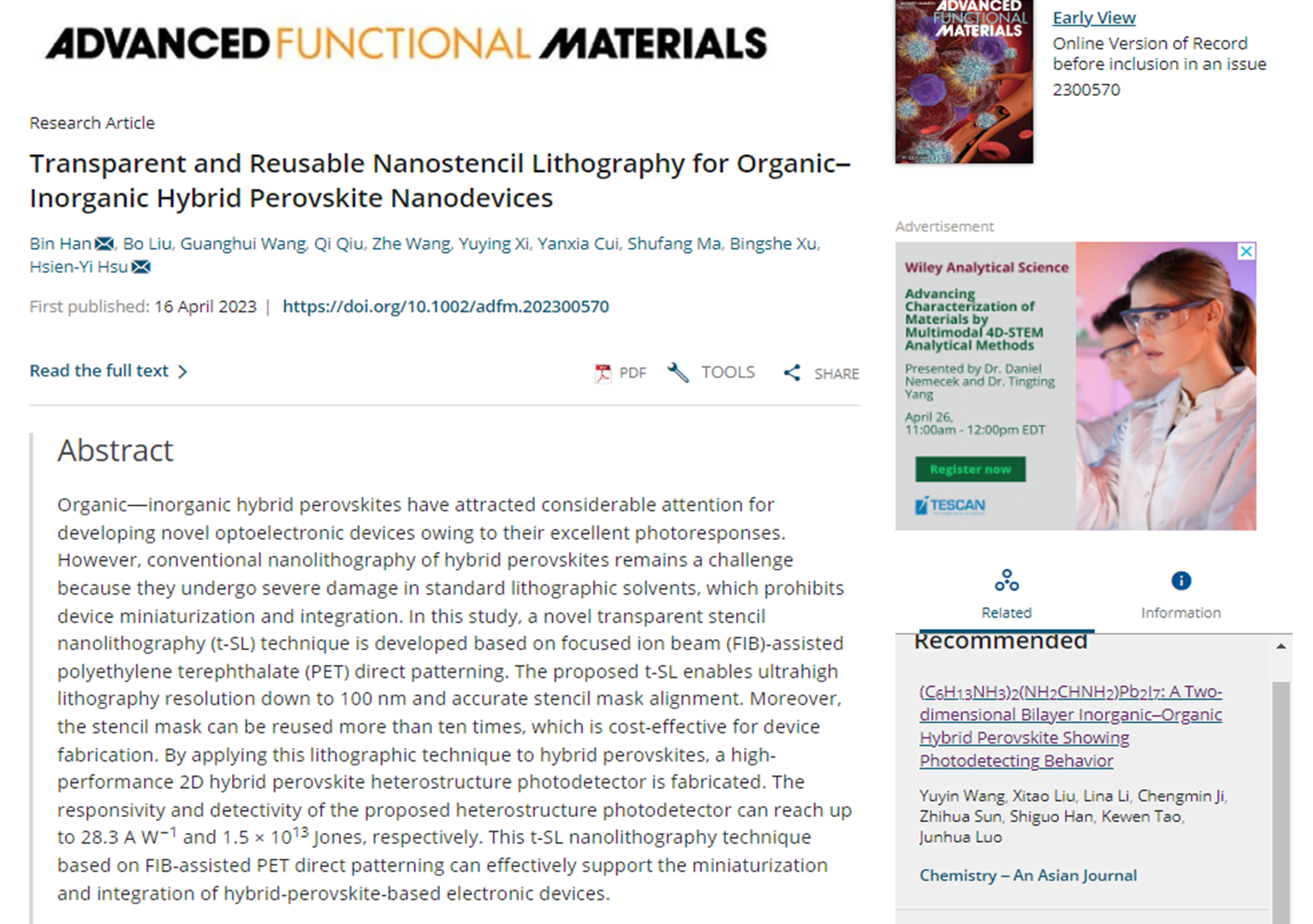 論文詳細(xì)信息:Bin Han, Bo Liu, Guanghui Wang, Qi Qiu, Zhe Wang, Yuying Xi, Yanxia Cui, Shufang Ma, Bingshe Xu, and Hsien-Yi Hsu,“Transparent and Reusable Nanostencil Lithography for Organic-Inorganic Hybrid Perovskite Nanodevices”Advanced Functional Materials,2023, 2300570. (DOI:10.1002/adfm.202300570)