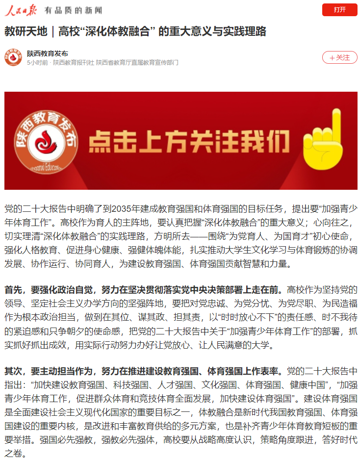 《人民日報》APP:高?!吧罨w教融合” 的重大意義與實踐理路