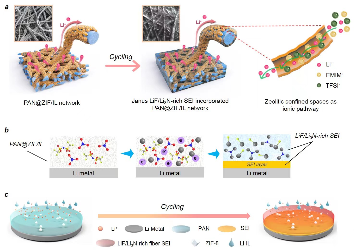鋰金屬具有高的比容量和最負(fù)的電極電勢(shì),是最具前景的負(fù)極材料,因此以金屬鋰為負(fù)極的鋰金屬電池具有較高的能量密度。但是鋰金屬電池的安全性和穩(wěn)定性仍然存在很大挑戰(zhàn)。針對(duì)鋰金屬電池的安全性問(wèn)題,我校蘇慶梅教授和黃文歡副教授合作構(gòu)建了離子液體限域MOF/聚合物三維多孔Janus膜,并在充放電循環(huán)過(guò)程中原位形成了富含LiF/Li3N的固態(tài)電解質(zhì)界面(SEI)膜。此三維Janus膜具有快速的鋰離子傳輸通道、優(yōu)異的室溫離子電導(dǎo)率(8.17×10-4S cm-1)和高的鋰離子遷移數(shù)(0.82)。并利用冷凍透射電鏡對(duì)SEI中原位形成的LiF和Li3N納米晶體以及鋰枝晶的沉積進(jìn)行了可視化監(jiān)測(cè),并對(duì)電池充放電過(guò)程中結(jié)構(gòu)演變進(jìn)行了理論模擬和動(dòng)力學(xué)分析。特別地,這種具有高熱穩(wěn)定性和機(jī)械強(qiáng)度的膜用于固態(tài)Li∥LiFePO4和Li∥NCM-811電池,甚至軟包電池,均顯示出優(yōu)異的倍率性能和超長(zhǎng)的壽命。此工作為新型固態(tài)電解質(zhì)的構(gòu)建提供了一種新的思路和方法。
