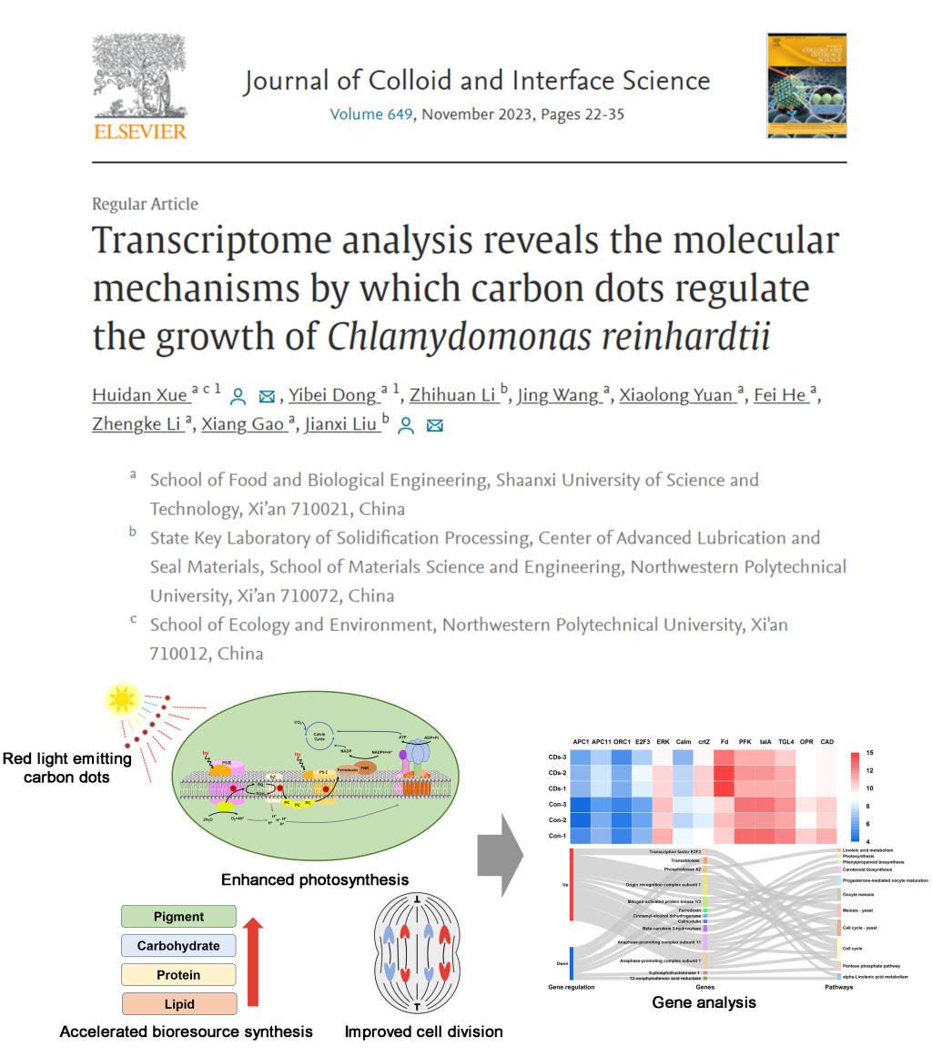 近日,食品科學(xué)與工程學(xué)院(生物與醫(yī)藥學(xué)院)藻類(lèi)生物技術(shù)與綠色開(kāi)發(fā)團(tuán)隊(duì)在物理化學(xué)領(lǐng)域一區(qū)TOP期刊Journal of Colloid and Interface Science(Q1,IF:9.965)發(fā)表題為“Transcriptome analysis reveals the molecular mechanisms by which carbon dots regulate the growth of Chlamydomonas reinhardtii”的研究論文。薛惠丹副教授作為論文第一作者和第一通訊作者,研究生董益貝為共同第一作者,陜西科技大學(xué)為第一作者和第一通訊作者單位,西北工業(yè)大學(xué)劉建喜副教授為共同通訊。該研究涉及了材料學(xué)和微生物學(xué)交互領(lǐng)域,揭示了碳點(diǎn)調(diào)節(jié)微藻生物量的分子機(jī)制,研究結(jié)果為擴(kuò)大納米材料在微藻類(lèi)生產(chǎn)、未來(lái)農(nóng)業(yè)和資源方面的應(yīng)用提供了理論支持。