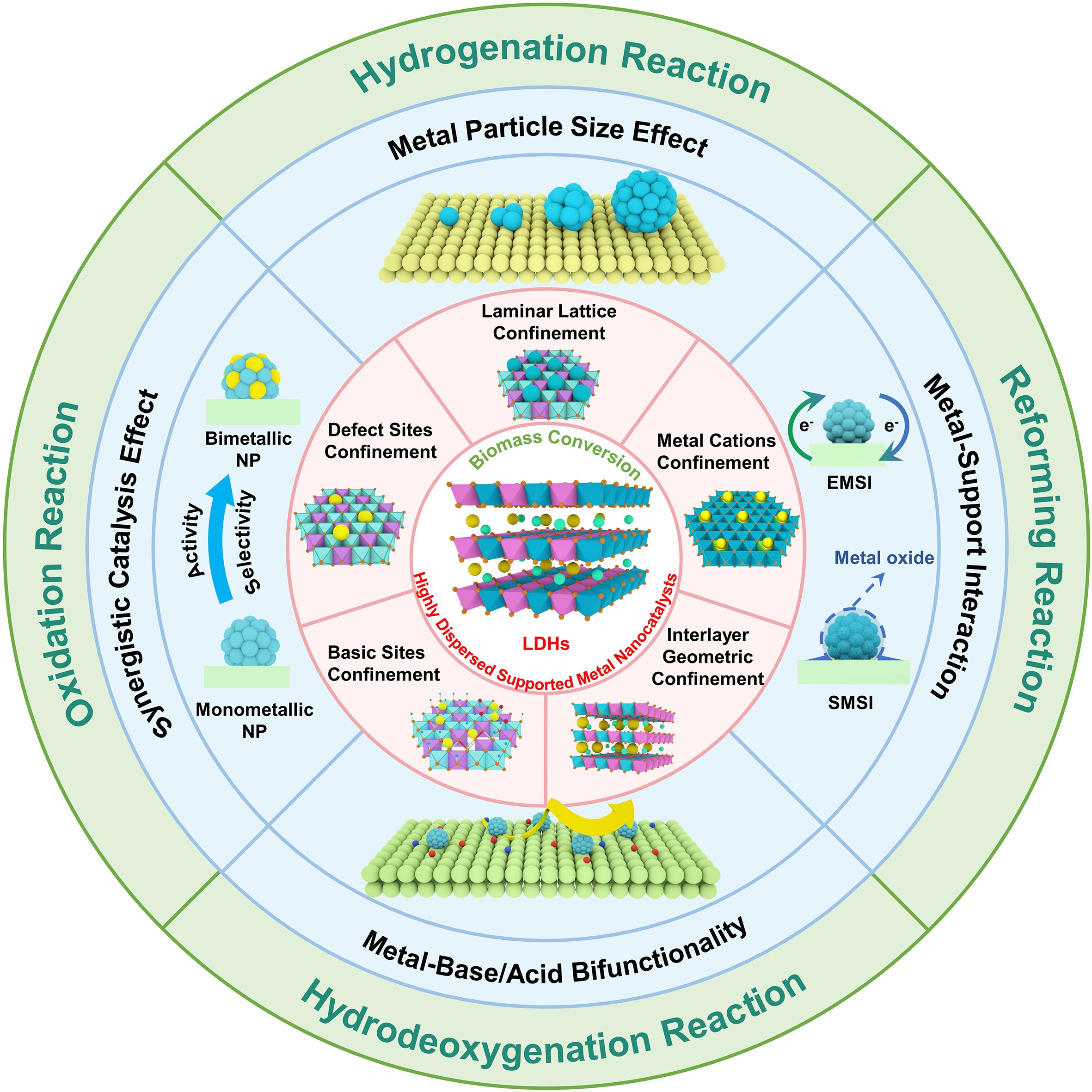 精準(zhǔn)調(diào)控負(fù)載型納米金屬催化劑的表面微環(huán)境包括幾何配位環(huán)境和金屬活性中心的電子態(tài),特別是對于高分散的單原子(SAs)、納米團(tuán)簇(NCs)和納米顆粒(NPs),是生物質(zhì)催化轉(zhuǎn)化制備高附加值燃料和化學(xué)品領(lǐng)域的研究熱點(diǎn)。層狀雙氫氧化物(LDHs)由于其層板構(gòu)成金屬組分在原子水平均勻分布、豐富的化學(xué)組成、獨(dú)特的限域效應(yīng)和結(jié)構(gòu)拓?fù)滢D(zhuǎn)變性質(zhì),是獲得具有特定表面微環(huán)境的高分散納米金屬催化劑的理想結(jié)構(gòu)平臺?;诖耍疚母鶕?jù)LDHs前驅(qū)體獨(dú)特的結(jié)構(gòu)性質(zhì)和催化活性金屬組分的種類不同,從全新的視角歸納了LDHs基高分散納米金屬催化劑(包括SAs、NCs和NPs)的限域合成策略;重點(diǎn)強(qiáng)調(diào)和總結(jié)了LDHs基納米金屬催化生物質(zhì)轉(zhuǎn)化反應(yīng)體系存在的微環(huán)境效應(yīng);全面綜述了LDHs基納米金屬催化劑在生物質(zhì)催化還原、氧化和重整反應(yīng)中的應(yīng)用,對各類納米金屬催化劑在生物質(zhì)催化轉(zhuǎn)化過程中的構(gòu)效關(guān)系和反應(yīng)機(jī)理進(jìn)行深入分析和思考;最后,詳細(xì)探討和展望了該領(lǐng)域目前面臨的挑戰(zhàn)和未來發(fā)展機(jī)遇。
