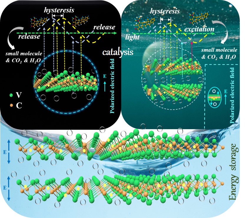 該工作首次發(fā)現(xiàn)V2C Mxene材料中存在本征極化電場和單相材料同時(shí)存在電子和空穴的雙等離激元(LSPR)效應(yīng)。通過調(diào)控V2C MXene晶體表面端基和減弱表面氧化程度,可增強(qiáng)了V2C MXene的本征極化電場,提升了空穴-電子的儲(chǔ)能效應(yīng),解決了單相材料催化體系同時(shí)儲(chǔ)存空穴與電子問題。暗光中可以直接釋放儲(chǔ)存h+和e-降解抗生素類污染物,LSPR效應(yīng)和壓電特性使V2C MXene有穩(wěn)定增強(qiáng)的全光譜廣譜礦化能力,該工作所提出的儲(chǔ)能催化機(jī)制突破了傳統(tǒng)單項(xiàng)材料不能同時(shí)儲(chǔ)存電子和空穴的障礙限制,為全天侯MXene儲(chǔ)能催化材料的研究和應(yīng)用提供新的研究思路。