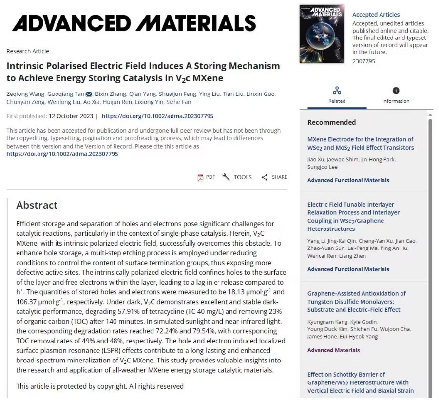 近日,我校材料科學(xué)與工程學(xué)院(文物保護(hù)科學(xué)與技術(shù)學(xué)院)納米催化&多鐵薄膜創(chuàng)新團(tuán)隊(duì)在儲(chǔ)能催化研究領(lǐng)域取得重要進(jìn)展,相關(guān)研究成果以“Intrinsic Polarized Electric Field Induces an Energy Storage Mechanism in V2C MXene for Catalysis”為題,發(fā)表于Wiley雜志社旗下的國際頂級(jí)期刊《Advanced Materials》(IF=29.4)。我校為論文唯一署名單位,談國強(qiáng)教授為論文通訊作者、碩士研究生王澤瓊為第一作者,參與該工作還包括其團(tuán)隊(duì)全體成員。該論文的發(fā)表提高了我校在儲(chǔ)能催化材料領(lǐng)域的國際影響力。
