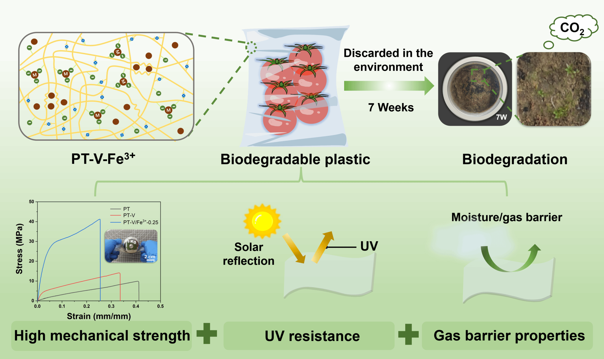 為進一步提高果膠基薄膜的耐水性,強濤濤教授通過酸催化縮醛反應(yīng)將香蘭素接枝到果膠鏈上,并在果膠基質(zhì)中引入Fe3+離子成功制備出了具有高強度、可耐水性和生物降解性果膠基塑料薄膜(PT-V/Fe3+)。